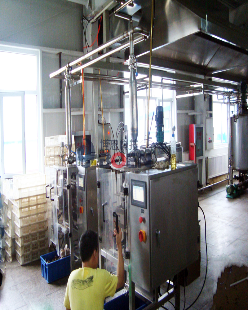 物料周转料仓→物料提升转子泵→包装机自动制袋→灌装机自动计量灌装→自动充填→自动封口→成品输送等